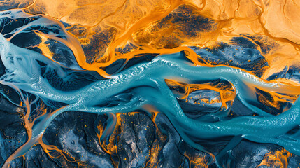 Aerial view of a colorful braided river in Iceland, an abstract natural background with intricate patterns and textures. A top down perspective of an alien landscape. Abstract aerial photography. The