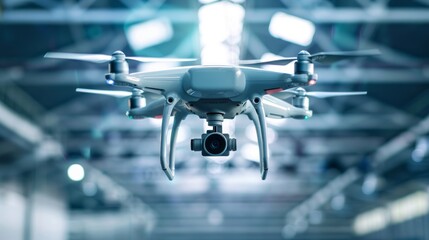 Drone in flight, industrial setting. A white drone hovers in a large industrial building, capturing aerial footage for inspection or surveillance.