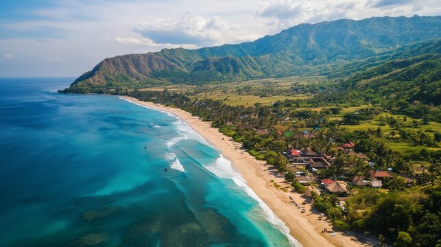 Aerial view of the rugged coastline, where lush green vegetation meets the textured sands of Pantai Kuta Lombok, creating a striking contrast, Kuta, Nusa Tenggara Barat, Indonesia.