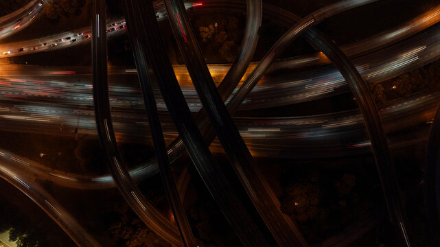 Aerial view of busy highway interchange with traffic and city lights at night, Atlanta, Georgia, United States.