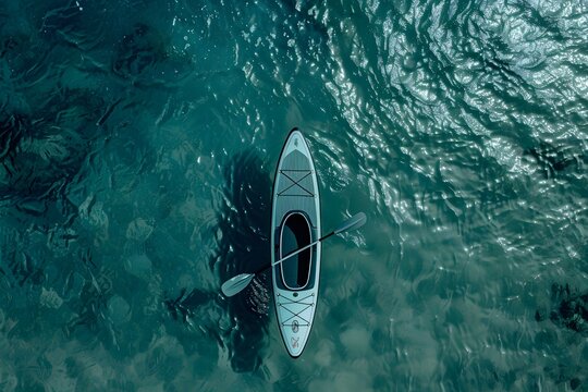 Aerial view of a lone inflatable kayak with a single paddle floating on a calm sea