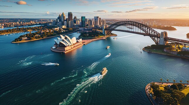Sydney Harbour Bridge in a beautiful summer day, Australia, Sydney, Australia. Landscape aerial view of Sydney Opera house near Sydney business center.