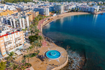 Spectacular Aerial Sunrise: Golden Light Over the Palm-Lined Promenade and Beachfront Hotels of Santa Eulària, Ibiza