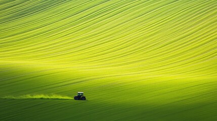 Overhead view of a brightly colored tractor cutting symmetrical stripes into a lush green field, showcasing geometric precision in agriculture.