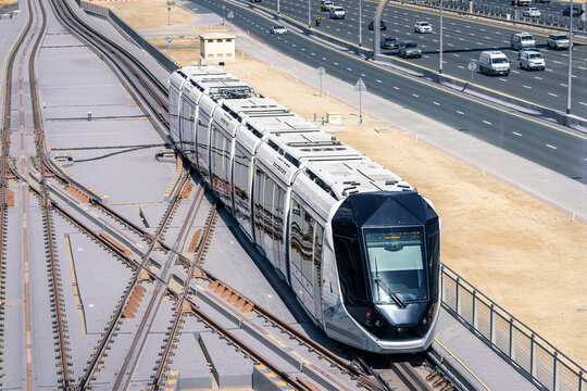 Hightech modern automated tram rides on the Sheikh Zayed Highway in Dubai, aerial view. Concept of public transport and railway interchanges