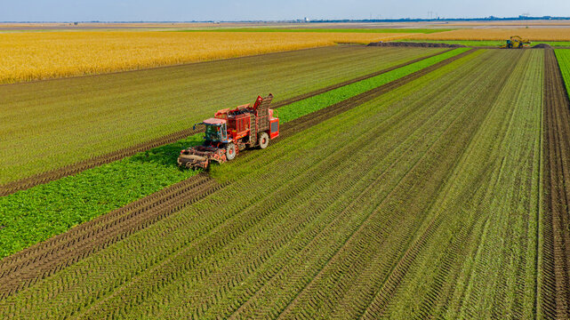 Aerial view of combine, harvester machine harvest ripe sugar beet