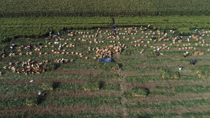 Aerial view on collecting, loading sugar beet into a truck for transportation