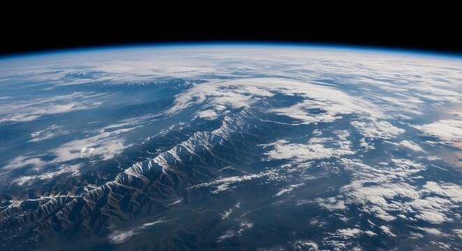 Earth's curve at sunrise, showcasing city lights and cloud formations against the dark expanse of space.  A blend of light and shadow, highlighting geographical details