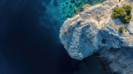 Top-down view of rugged cliffs beside crystal-clear turquoise waters
