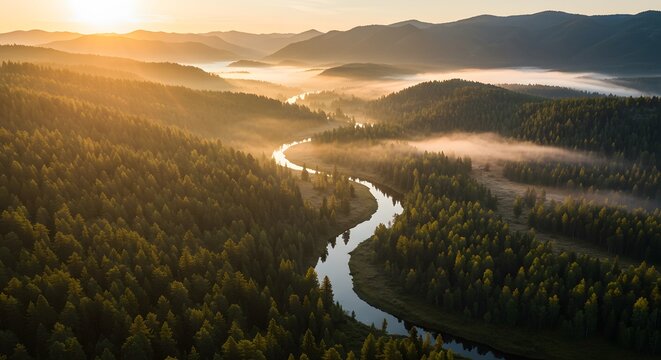 Aerial view of serene valley with meandering river