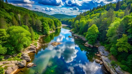 Aerial River Embrace: An aerial perspective captures a vibrant river meandering through a lush, verdant forest.