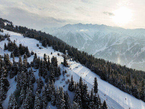 Aerial view of val de bagnes with frozen pines, ski slope, and picturesque cabins, bruson, valais, switzerland.