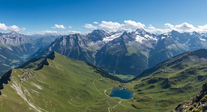 Panoramic view of majestic mountain ranges with serene lakes reflecting the sky under a clear blue sky with scattered clouds.