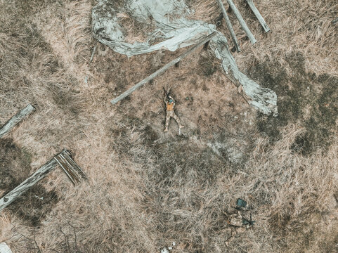 The soldier lies disguised on the dry grass and prepares to fire a weapon - aerial overhead top view drone shot. Conducting infantry combat in Ukraine.