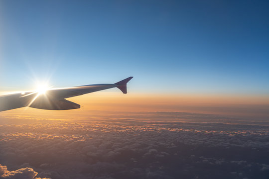 Up in the air, view of aircraft wing silhouette with dark blue sky horizon and cloud background in sun rise time, viewed from airplane window
