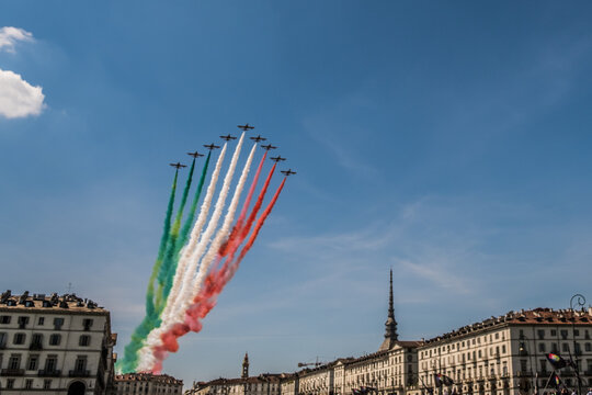 The Italian "Tricolour Arrows" make a show in the sky of Turin for the Coronavirus