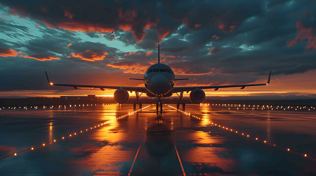 Sunset Landing: A stunning image capturing an airplane gracefully landing amidst the vibrant hues of the setting sun, blending the elements of the sky, runway, and lights