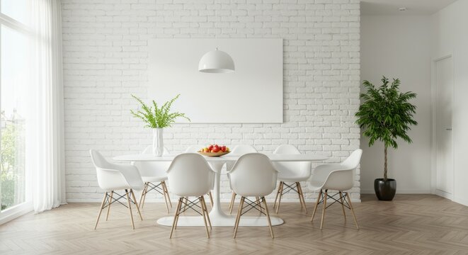 Modern minimalist dining room, white walls, wooden floor, white chairs, long dining table, potted plants, large empty frame on wall, floor lamp, bright natural lighting, Scandinavian design, clean aes