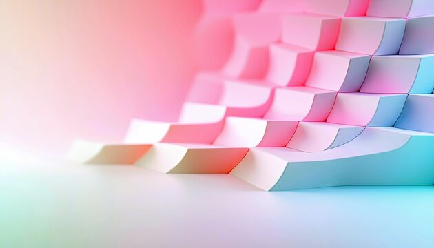 An abstract composition of layered geometric shapes resembling steps, illuminated with soft pastel pink, blue, and white light, creating a serene and modern aes