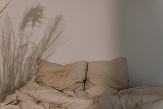 Bedroom concept. Comfortable bed with crumpled beige bed linens, pillows, dry grass. Sunlight shadow reflections. Morning in bed