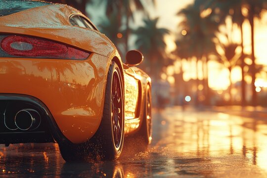 A vibrant orange sports car parked on a wet street at sunset, surrounded by palm trees.