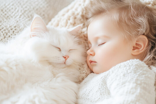 Baby and white cat rest together in serene dreams.