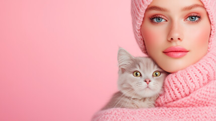 Close up portrait of stylish fashion woman with flawless beautiful makeup with grey fluffy cat on pink background.
