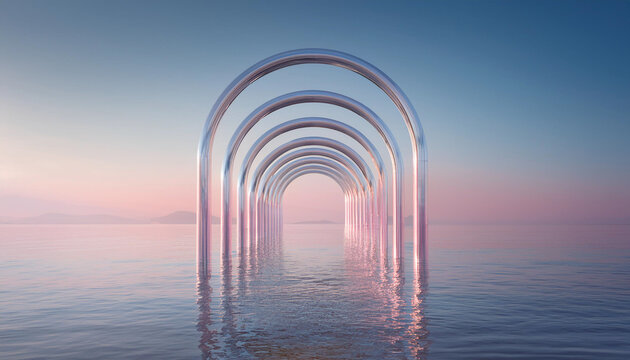 3d render, abstract zen seascape background. Nordic surreal scenery with geometric mirror arches, calm water and pastel gradient sky. Futuristic minimalist wallpaper