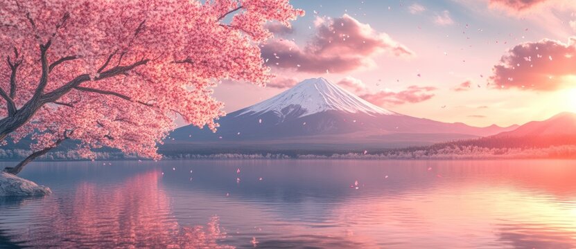 Serene sunrise over snow-covered mountain peak with soft pastel colors in the sky and bright sun illuminating the landscape below