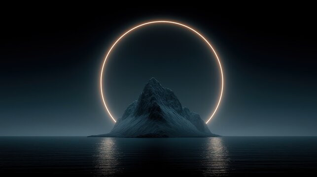 Minimalist 3D render of glowing neon circle halo above mountain island in dark ocean with soft lighting and serene atmosphere