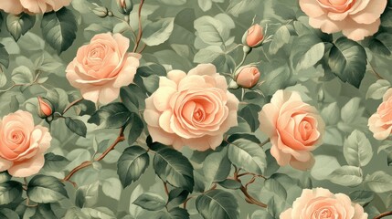 Peach roses blooming garden, lush foliage background, romantic floral design, textile print