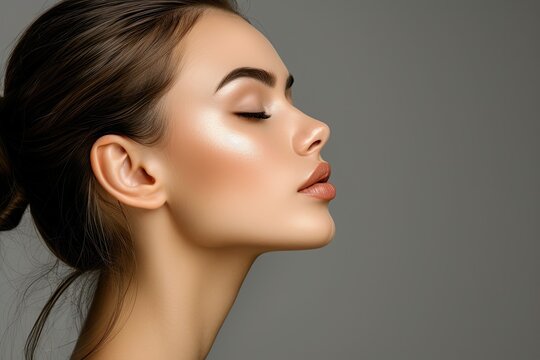 Close-up profile of a caucasian girl with perfect young fresh skin on a gray background. Facial care and face profile correction