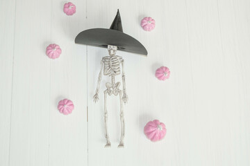 Halloween skeleton toys and hands against dark background