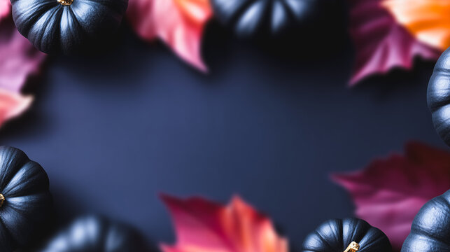 Dark Halloween frame with black pumpkins and moody fall leaves on a navy background