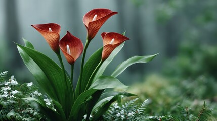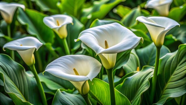 Close up image featuring soft focus on Arum lily leaves creating a lush green backdrop Zantedeschia aethiopica or calla lily part of the Araceae family is showcased. with copy space image