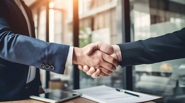 Two female lawyers in business suits meet at wooden desk, shaking hands over contract paper. wooden gavel and scales justice as discuss legal compliance, corporate law, dispute resolution.