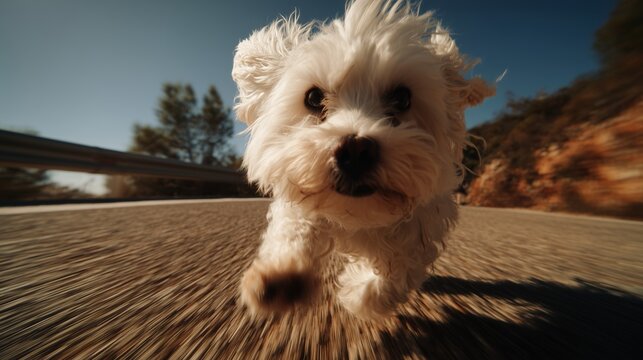 Perro Pequeño Blanco Corriendo Enérgicamente Hacia la Cámara, Desenfoque de Movimiento Dinámico, Libertad y Aventura: Perro de Raza Pequeña Corriendo Rápido, Capturado con Efecto Ráfaga Cinemático