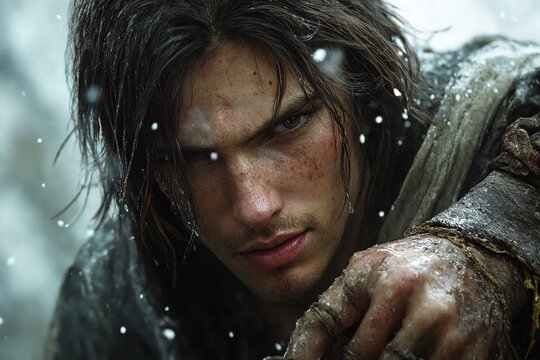 Un joven sobreviviente lucha contra la adversidad en un paisaje nevado y desolado.