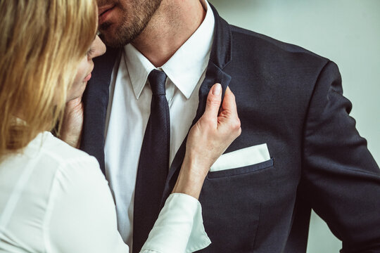 Young businesswoman holding jacket collar of businessman. Flirting couple of unrecognizable caucasian people. Passionate love affair in office workplace. Close up shot.