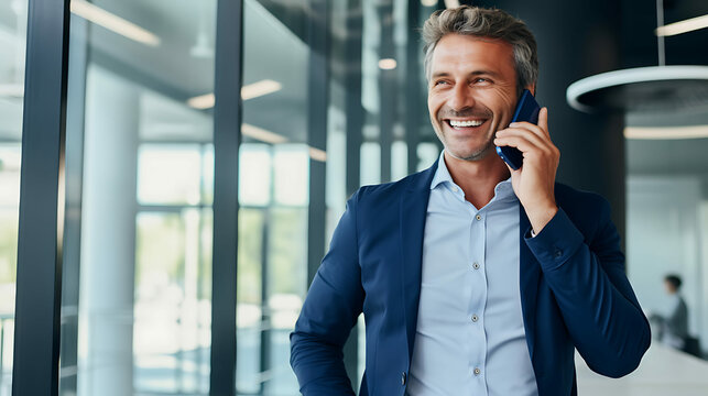 Happy business man talking on mobile cell phone device looking away standing at work. Smiling professional businessman making call on smartphone working with cellphone in office