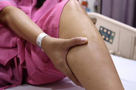 Asian woman sitting on patient bed with arms holding his painful leg caused by prolonged standing. Carpal tunnel syndrome, arthritis, neurological disease concept. Numbness of the leg
