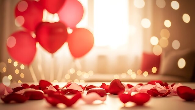 Romantic heart balloons and rose petals in cozy room with warm lighting