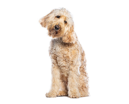 Adorable labradoodle puppy sitting and tilting its head with curiosity