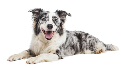a cheerful dog with a striking coat lies down showcasing its pla