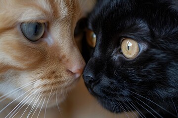 Two adorable cats, one orange and one black, cuddle together with a red heart, symbolizing love and friendship in a cozy home setting.