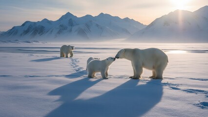 An affectionate moment between a polar bear cub and its mother on the snowy plain with mountains