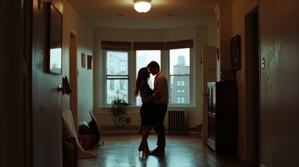 Silhouettes of a couple sharing a tender moment, dancing in a cozy apartment, surrounded by the soft glow of the evening light.