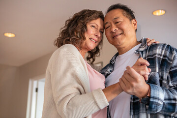 Senior couple dancing in living room by beige walls under warm ceiling lights holding hands