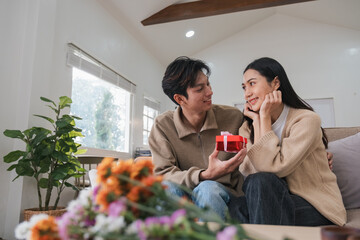 Smiling couple enjoying affectionate moment on couch