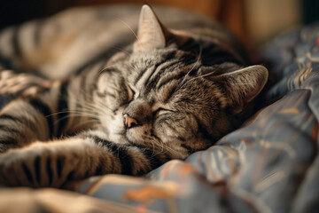 A Ragdoll cat reclines on a comfortable bed in a minimalist bedroom, enveloped by soft pillows and blankets. The serene, neutral-toned setting enhances the cat's relaxed posture and peaceful atmospher
